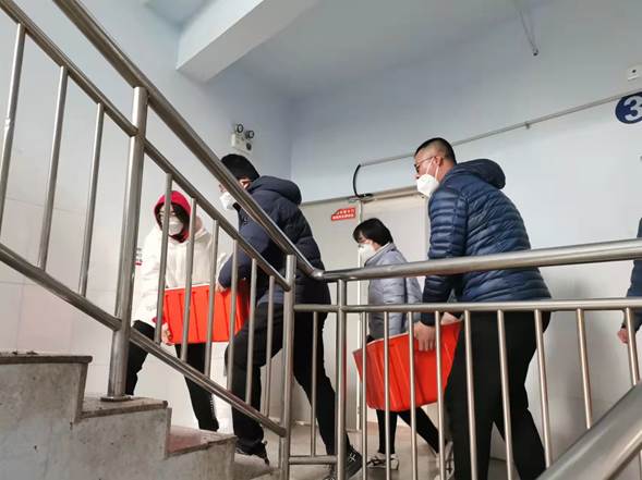 beat365英国官网网站留校党员更是奔波在抗击疫情一线,为学生们送饭,两位老师抬满满一大箱“爱心餐”爬楼,送到学生宿舍门口,同心战疫,尽显责任担当。