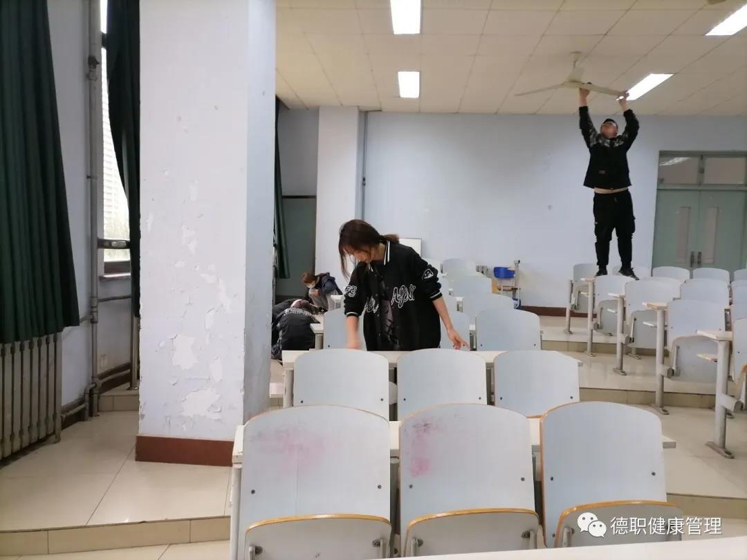 由卫生部部长赵志浩同学开会讲述打扫中的注意事项及细节,经过分组后,领取工具,同学们去往各自卫生领域进行扫除,各组热火朝天的开始,同学们分工明确,各司其职,积极主动地参与其中,扫地、抹课桌、擦玻璃、擦门框、擦灯台,整理桌堂、拖地,确保不留下任何一个卫生死角,忙得不亦乐乎。