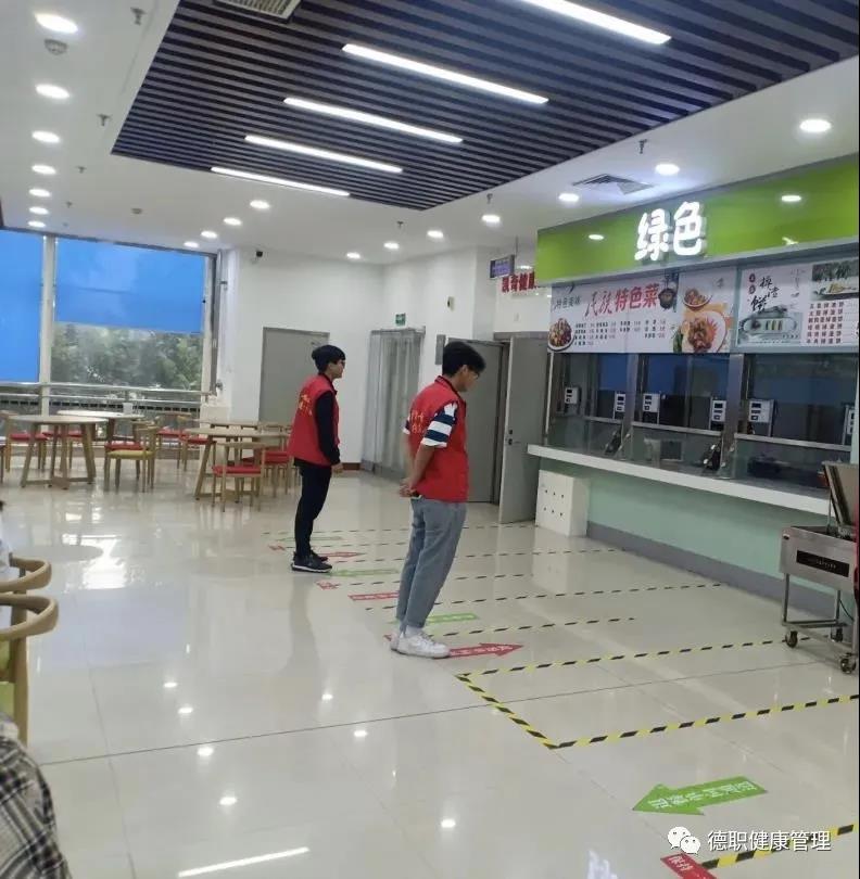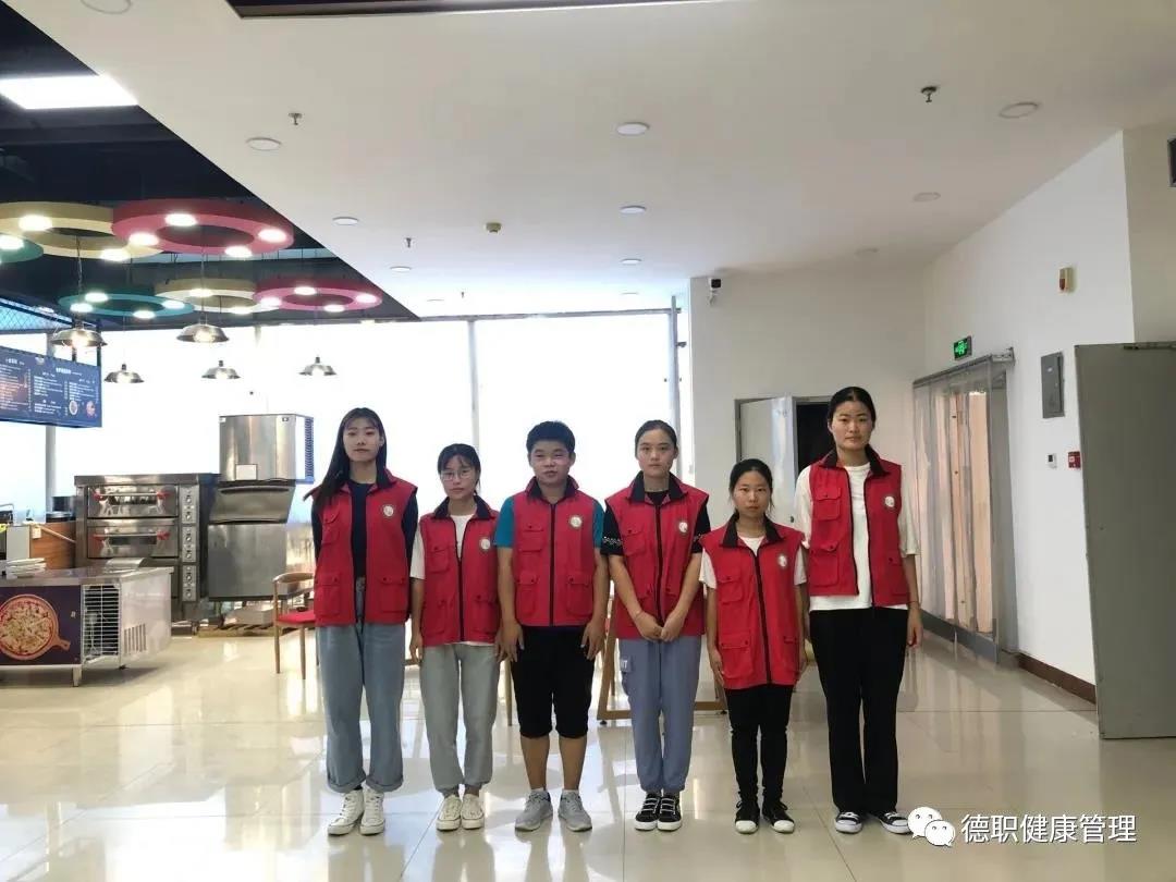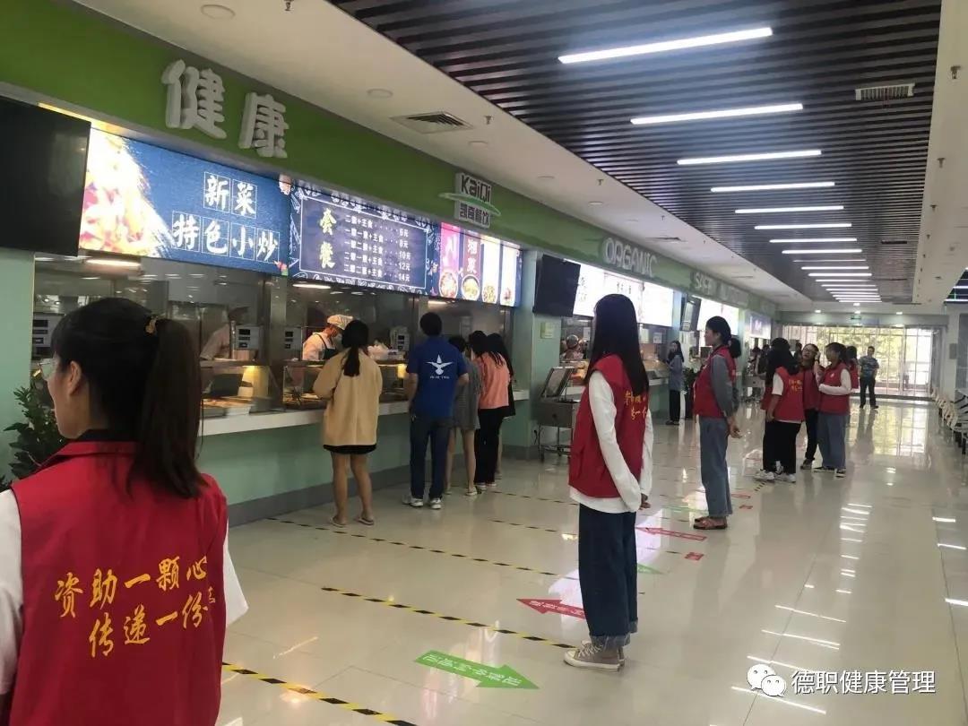 活动中,他们身着红色马甲,精神饱满地为师生提供志愿服务。他们有的在维持就餐秩序,提醒、引导就餐师生正确入座用餐,有的在监督就餐同学保持桌面和就坐地面整洁,并提醒用餐同学用餐结束后自收餐具,送到集中收集处,争做新时代文明大学生。