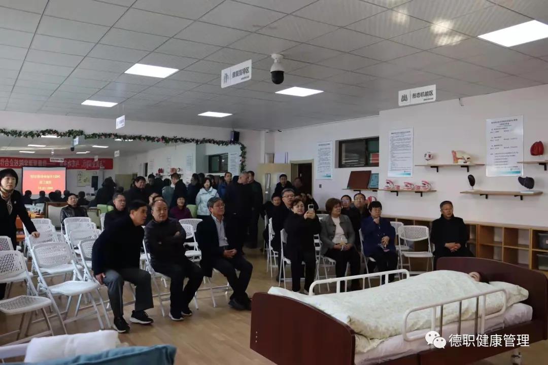 接着,通过视频形式向观摩团的领导和老师们展示介绍了校企共同投资建设的校外产教融合实训室建设情况。王倩老师重点讲解了老人居室样板间和“智慧康养区”设备。老人居室样板间是按照养老机构中的标准1:1打造,同时增加了一键呼叫器、烟感器、门磁、人体红外感应仪等智能设备,用于学生的仿真教学和技能大赛的模拟训练。“智慧康养区”购置了肢体评估康复运动系统设备,它可以利用物联网+实现“评估、康复、干预”三合一的个性化健康服务,真正实现智能居家养老。最后,由健康评估人员和模特通过“蜜蜂采蜜”“弹钢琴”两项游戏,模拟演示了“老人关节活动度评估康复训练项目”。