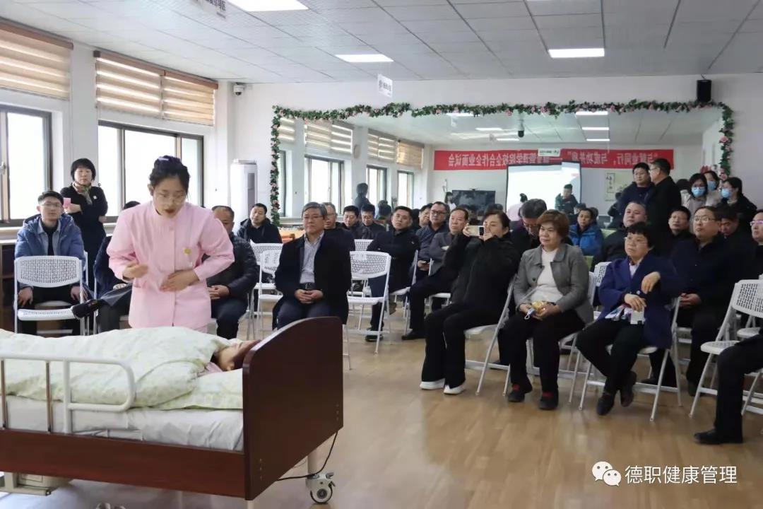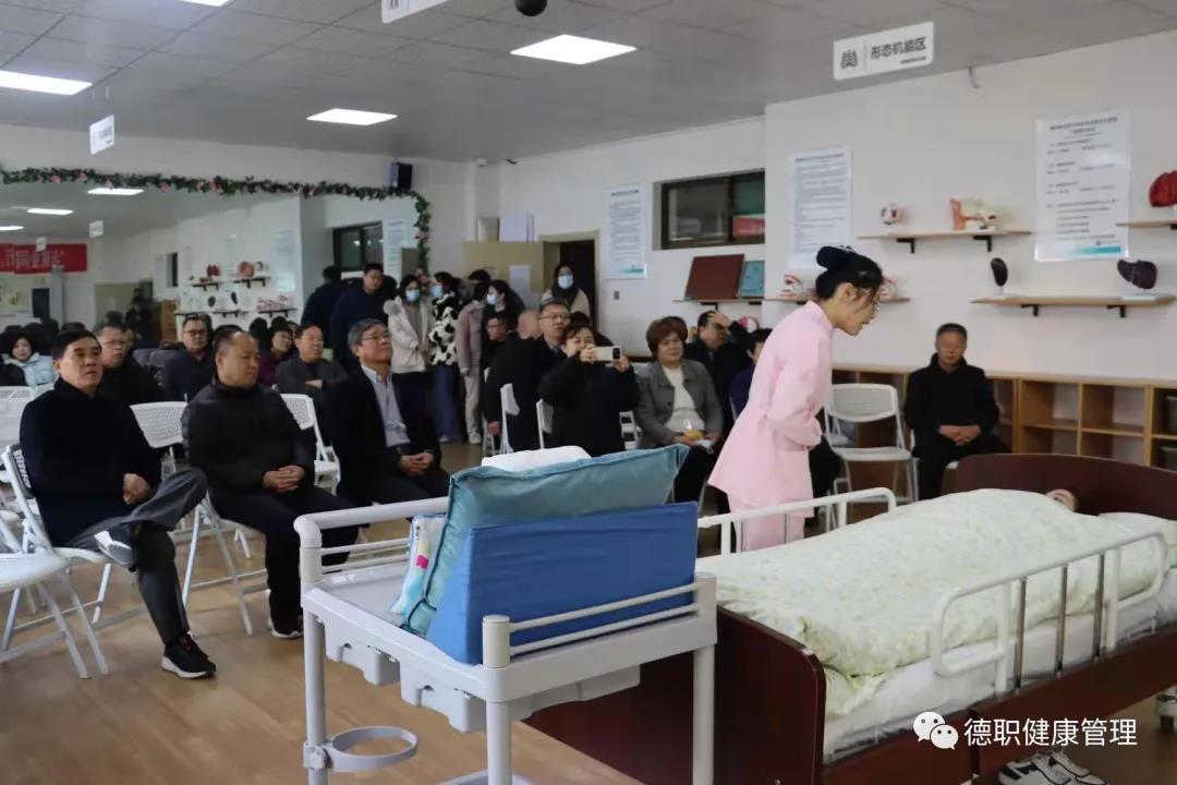 最后,刘斐斐老师介绍了beat365官网一年来的亮点工作和技能大赛取得的成绩,指导获得省“技能兴鲁”健康照护赛项二等奖的吕莲莲同学进行“协助偏瘫老人进行床上翻身训练”的演示汇报,现场观摩团的领导和老师们认真观看,跟随汇报的同学一起模拟,大家表示这样贴近生活实际的技能非常有推广的价值。