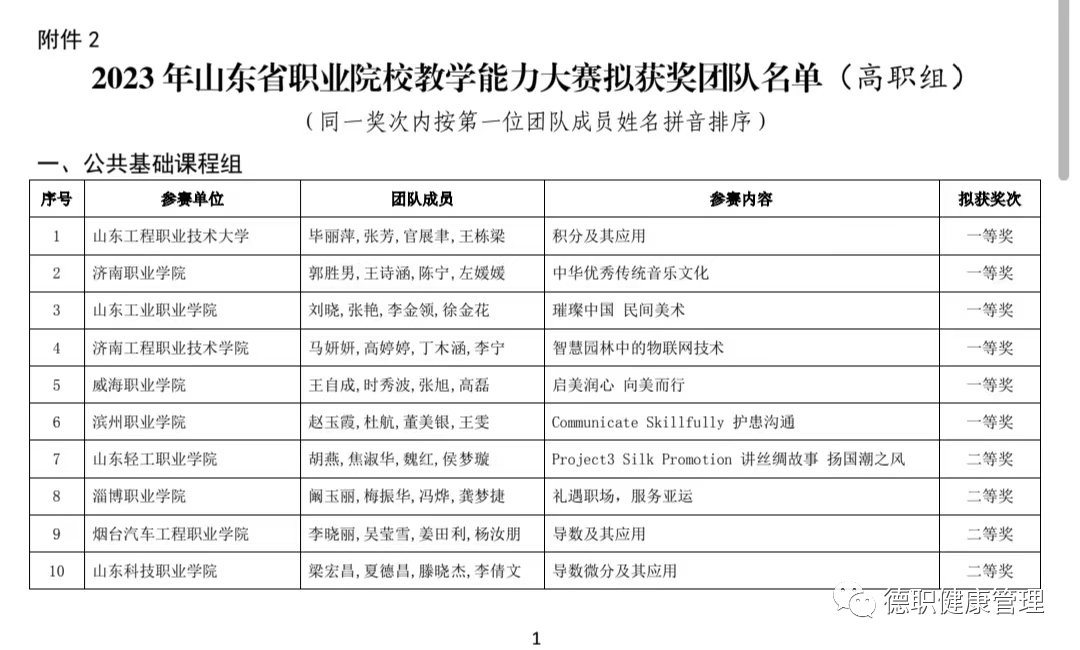 近日,由山东省教育厅主办的2023年山东省职业院校教学能力大赛拟获奖团队名单公布,吴双、王倩、王霄琳、吕志伟老师的参赛作品《坠床的预防与照护》获山东省职业院校教学能力大赛(高职组)专业课程二组三等奖,本次大赛是对学院教师教学能力的实战检验,同时彰显了beat365官网年轻教师的精神风貌。