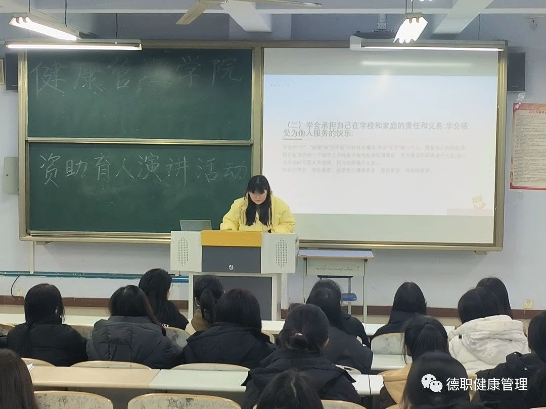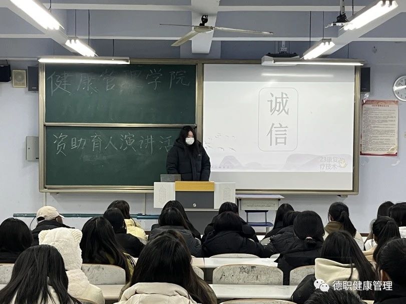 随后,由23级健康管理一、二班,23级康复治疗一、二班班级代表们讲述了国家学校的资助政策的意义。国家采用精准扶贫、教育扶贫、健康扶贫等政策对困难户进行帮扶,体现了国家对打赢脱贫攻坚战的决心。而学校的奖、助、贷、减、免、补六位一体助学体系为学生的学习生活提供了坚强的后盾,并呼吁大家要感恩那些向我们伸出援手的人们,感恩在苦难中坚持的自己,积极进取、励志成才。