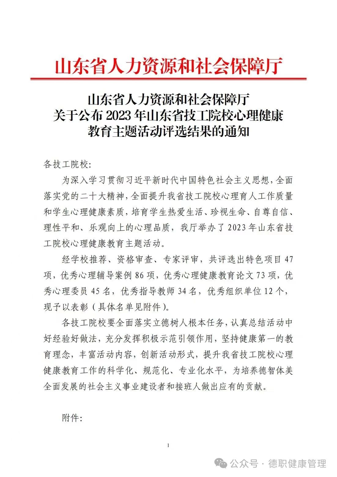 2024年1月24日,山东省人力资源和社会保障厅关于公布《 2023 年山东省技工院校心理健康教育主题活动评选结果的通知》,beat365官网beat365英国官网网站范轶、齐宁、孔妍撰写的《“修身养性,悦纳心灵”八段锦助力学生身心健康成长》获山东省技工院校心理健康教育特色活动项目二等奖,是我系在心理健康教育领域取得的一次重要突破。