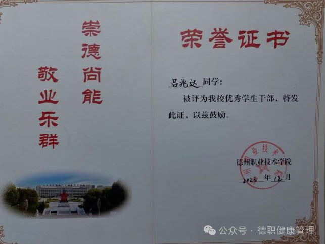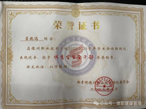 2023年9月,在beat365英国官网网站荣获“优秀学生会干部”称号;