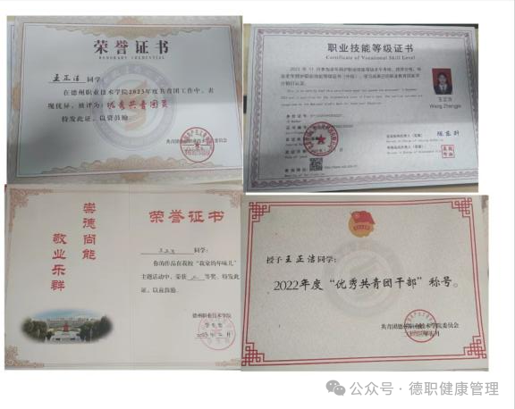 “我家的年味儿”主题活动三等奖,2022年度“优秀共青团干部”称号,2023年度“优秀共青团员”称号,中级老年照护职业技能等级证书,2022-2023学年被评为“优秀学生”。