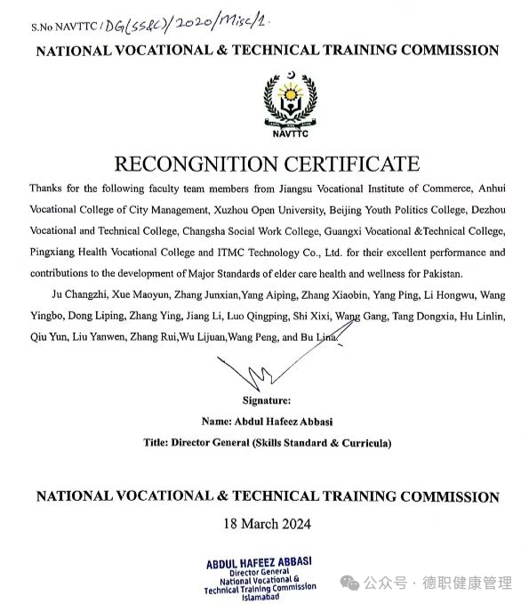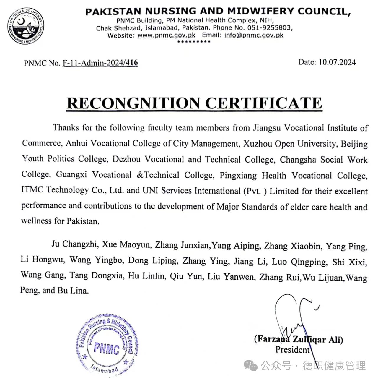 近日,beat365官网智慧养老专业教师参与制定的“巴基斯坦老年照护专业标准开发项目”获得巴基斯坦老年照护专业标准国家职教委认证和巴基斯坦卫生部助产与护理委员会认证。