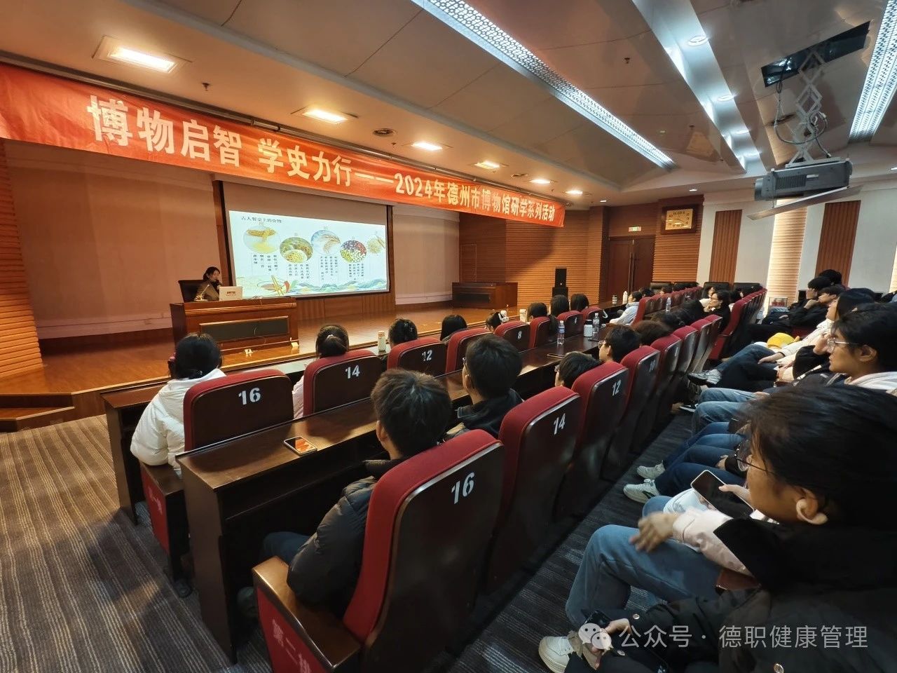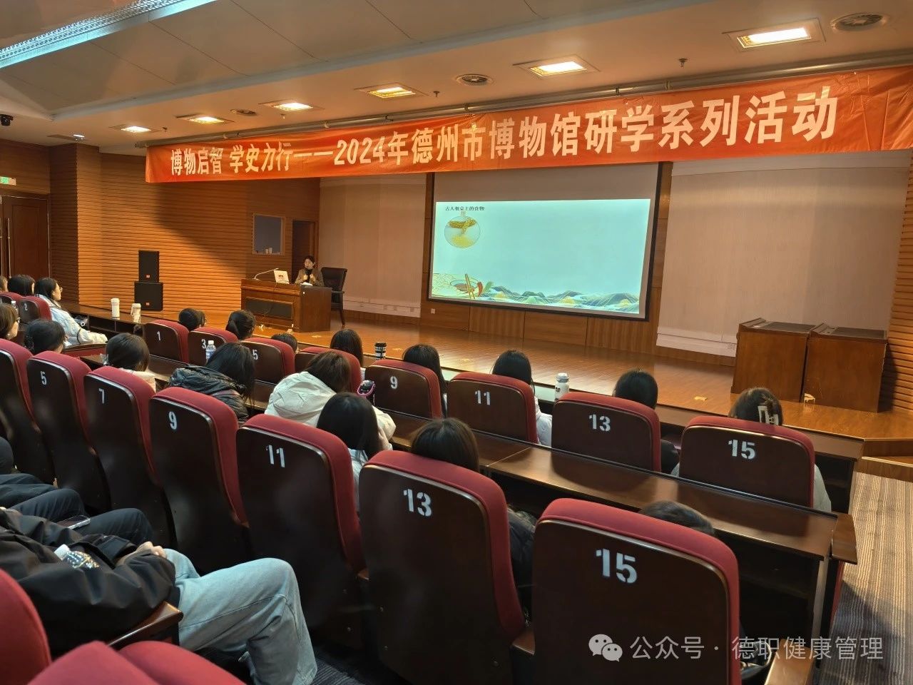 活动伊始,同学们首先聆听了博物馆宫凯老师做得题为“古人吃饭那些事儿”的专题讲座。宫老师从古代人的食物种类、器皿、外来食物等方面结合馆藏文物讲解了古代人民的饮食文化及其背后的历史故事,让大家通过历史文物感受到了古人的智慧,进一步增强了文化自信。随后,范轶书记进行了精彩的总结讲解,她希望同学们回忆所学的知识,结合研学内容走进展厅,近距离的去感受德州历史的厚重与博大。