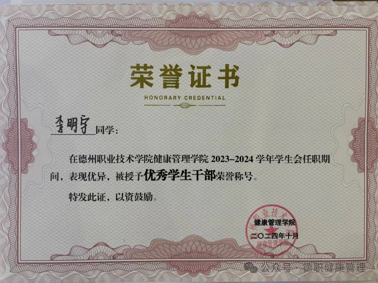 2024年10月在beat365英国官网网站2023—2024学年学生会任职期间,表现优异,被授予优秀学生干部称号。
