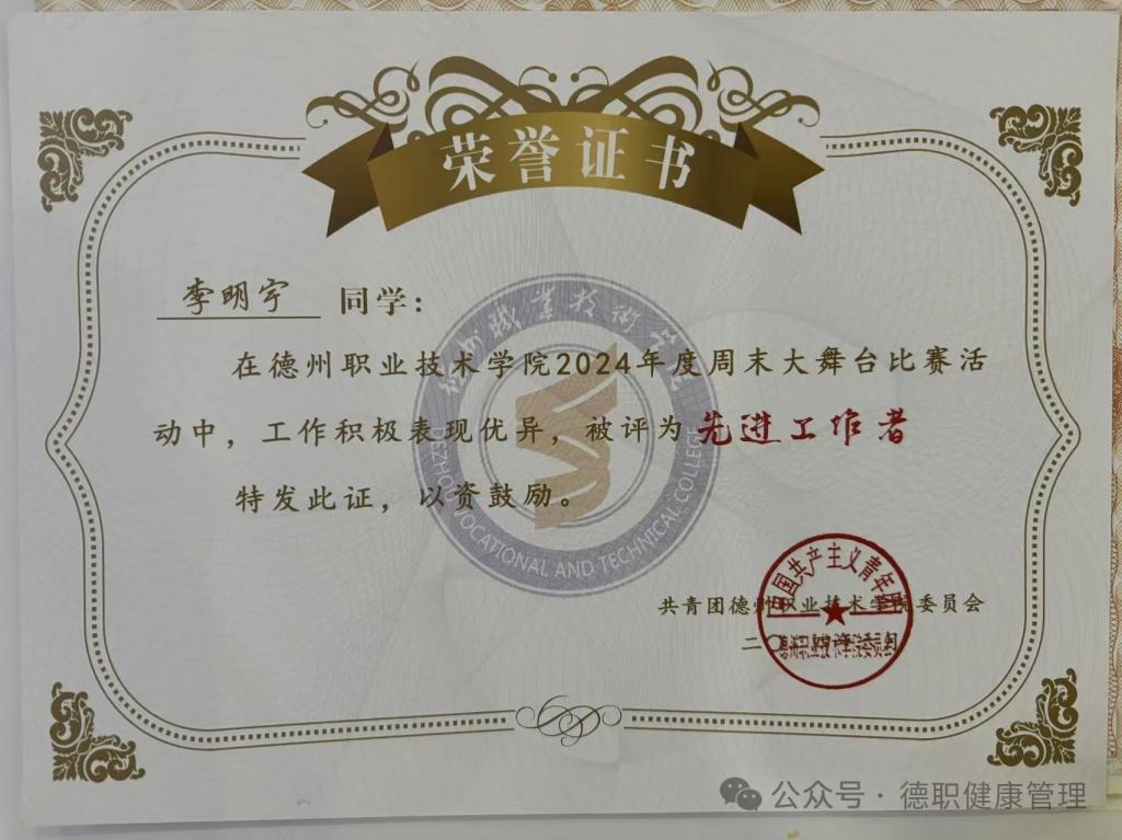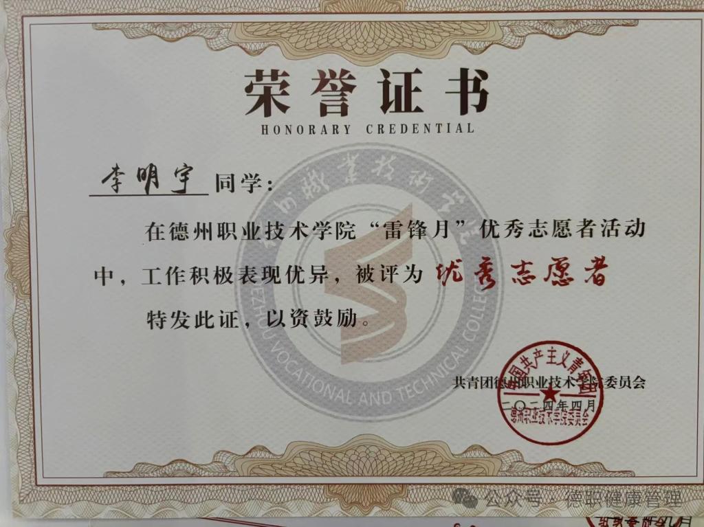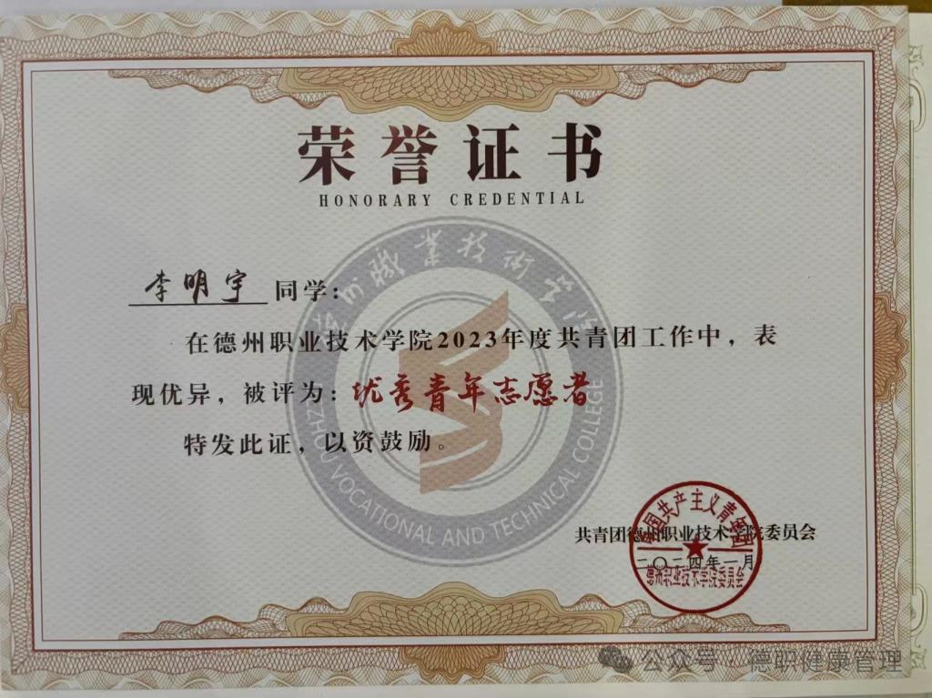 2023年9月在德州市第七届运动会开闭幕式中,工作优秀,表现突出,被评为“优秀青年志愿者”。