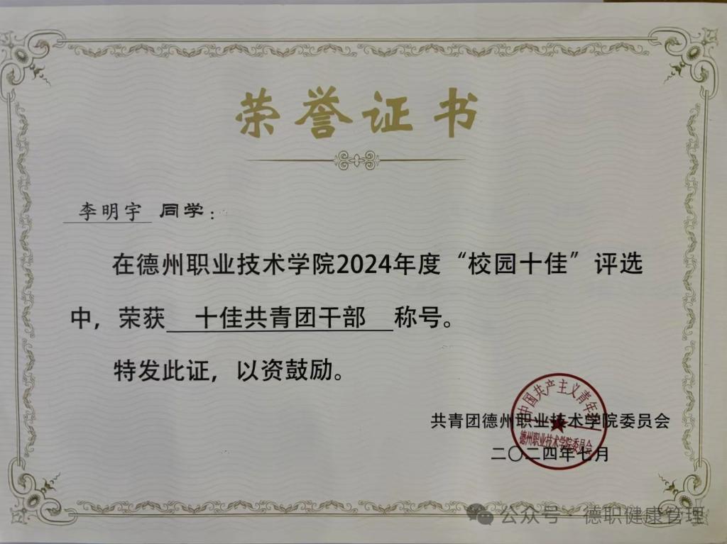 2024年7月在beat365英国官网网站2024年度“校园十佳”评选中,荣获十佳共青团干部称号。