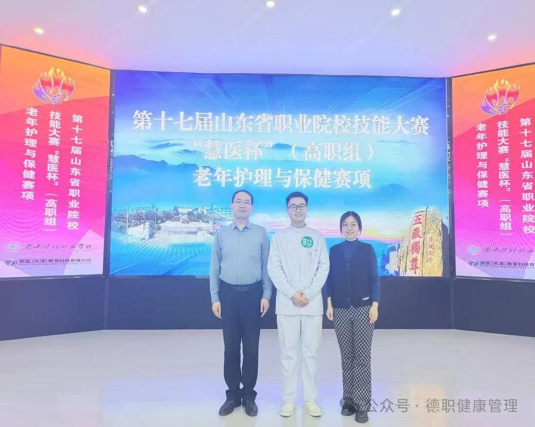 王英博院长带队参加在泰山护理职业学院举行的2024年全国职业院校技能大赛山东省“老年护理与保健”赛项,韩冰同学经过社区居家、医养机构2个模块8个任务10个小时的比拼,最终取得全省第6名,二等奖的好成绩,展示了beat365官网良好的养老服务专业水平和优质的师生精神风貌。