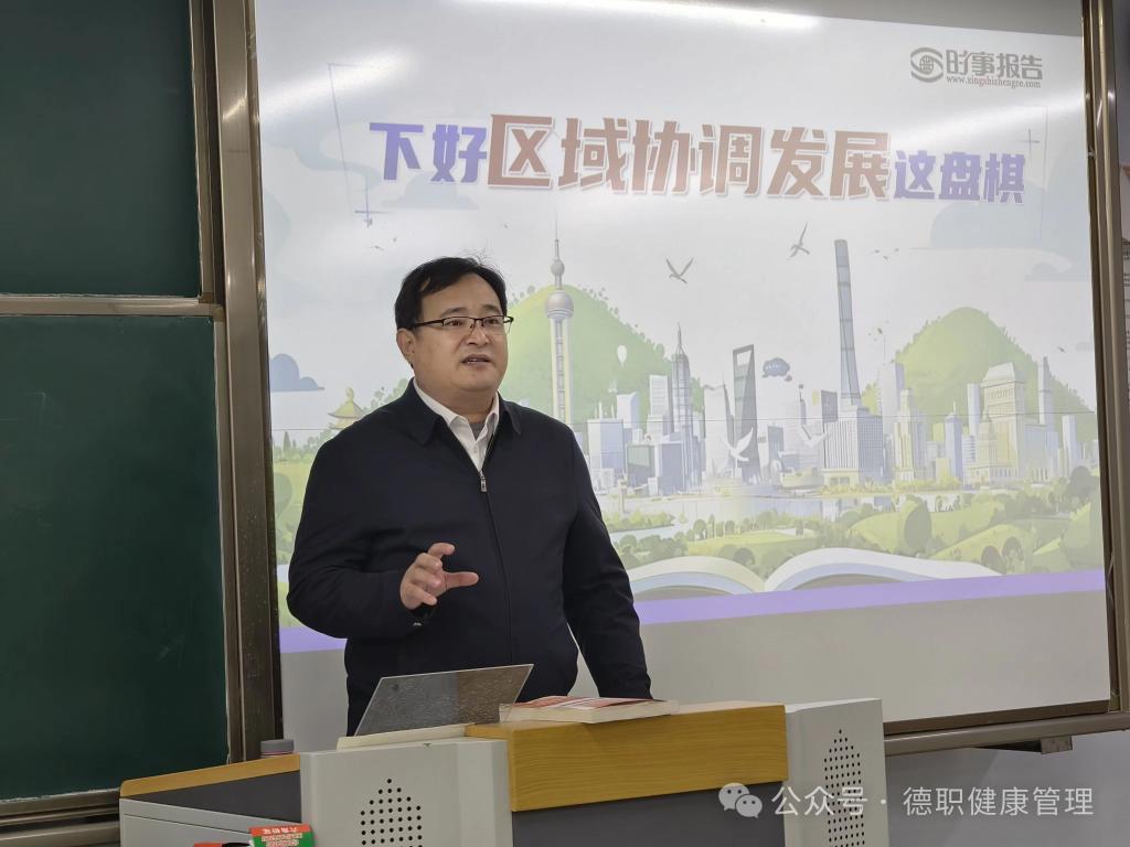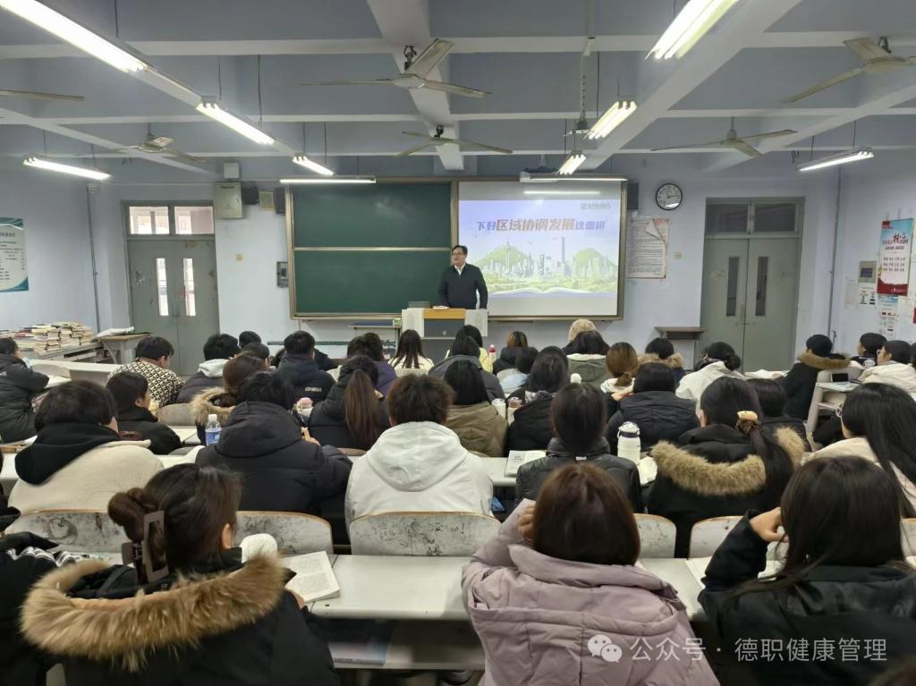 为帮助学生正确认识国内外形势,深刻领悟党和国家的政策,12月24日上午,beat365英国官网网站党委委员、办公室主任、宣传部部长朱弘为beat365英国官网网站24级智慧健康养老服务与管理一班和五班的同学们讲授了一堂形势与政策课,讲授的主题为“下好区域协调发展这盘棋”。