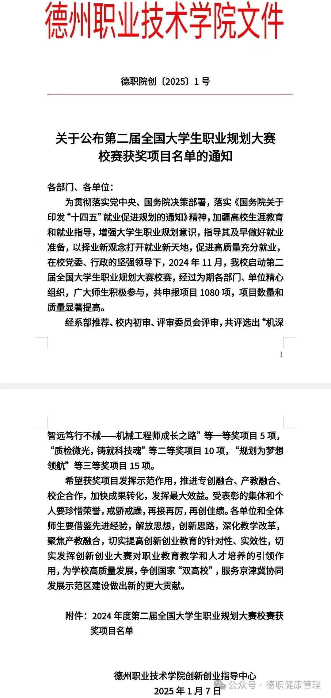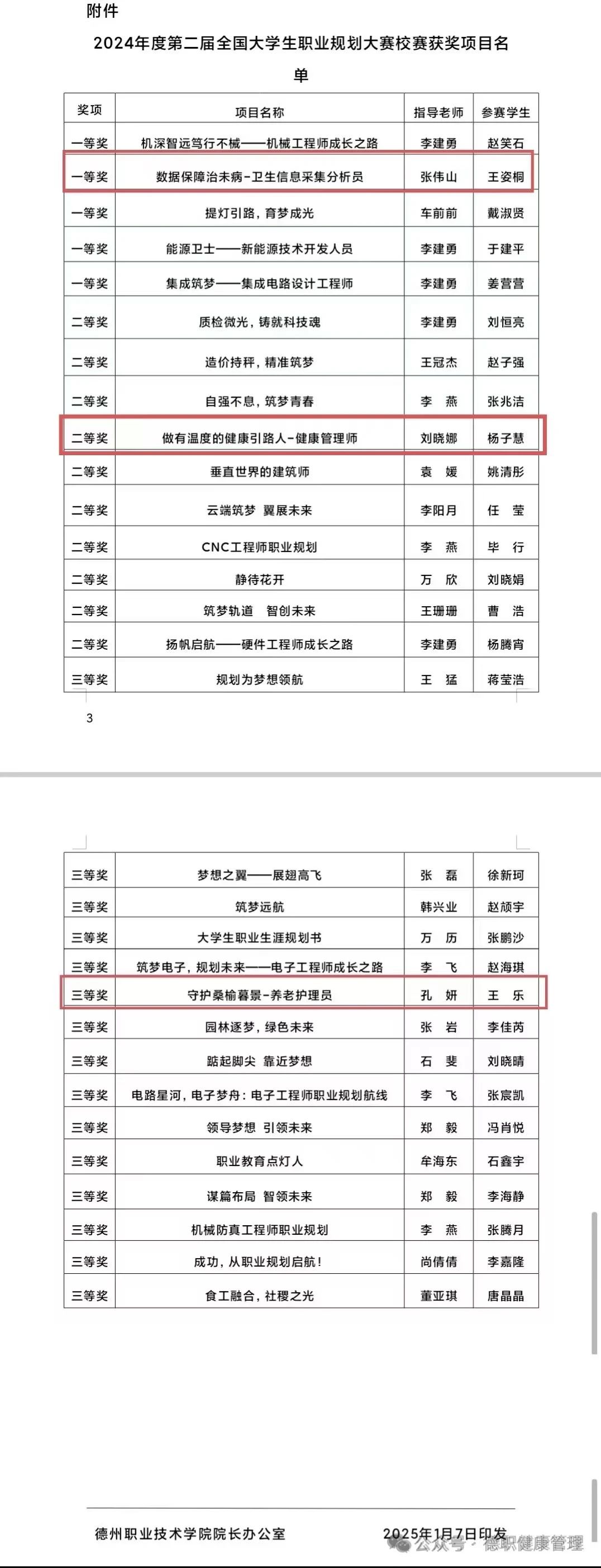 2025年1月7日,beat365英国官网网站公布了第二届全国大学生职业规划大赛校赛获奖项目名单,beat365英国官网网站2024级大数据管理与服务一班王姿桐荣获一等奖、2024级健康管理一班杨子慧荣获二等奖、2023级智慧健康养老服务与管理一班王乐荣获三等奖。