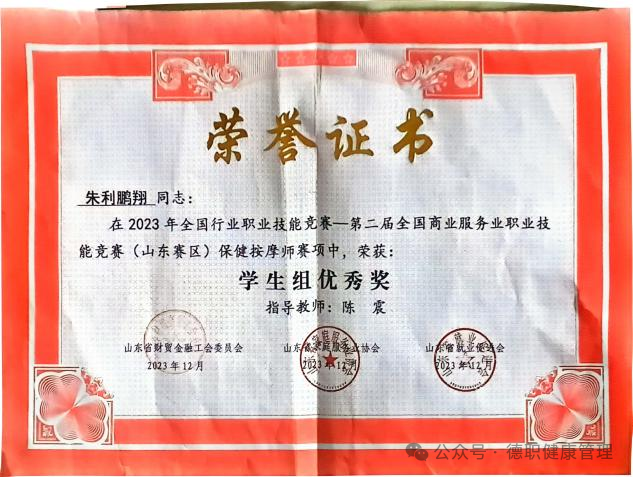 2023年12月2023年全国行业职业技能竞赛(保健按摩师赛项)”荣获"优秀奖”;