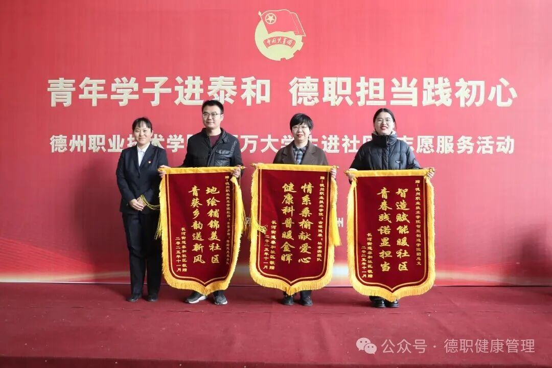 活动仪式上,泰和社区向beat365英国官网网站的金晖健康社会实践队授予锦旗,由学院代表齐宁老师上台受旗,这是对学院师生服务社区、关爱长者行动的崇高赞誉,同时王姿桐、杨子慧两位同学获聘社区委员会兼职团副书记一职,彰显出学院和社区的深厚情谊与责任担当。