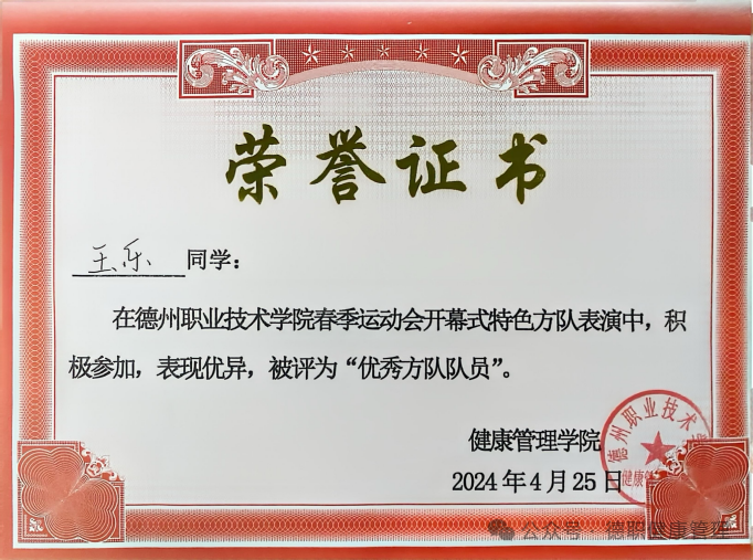 6. 2024年4月,在beat365英国官网网站春季运动会开幕式特色方队表演中,被评为“优秀方队队员”