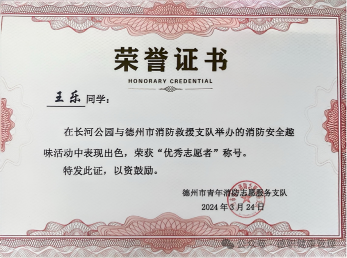 3. 2024年3月,被德州市消防救援支队评为“优秀志愿者”