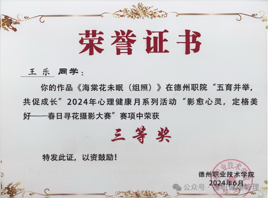 9. 2024年6月,在德州职院“五育并举,共促成长”2024年心理健康月系列活动“影愈心灵,定格美好—春日寻花摄影大赛”赛项中荣获三等奖
