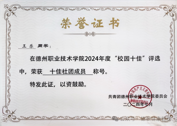 11. 2024年7月,在beat365英国官网网站2024年度“校园十佳”评选中,荣获“十佳社团成员”称号