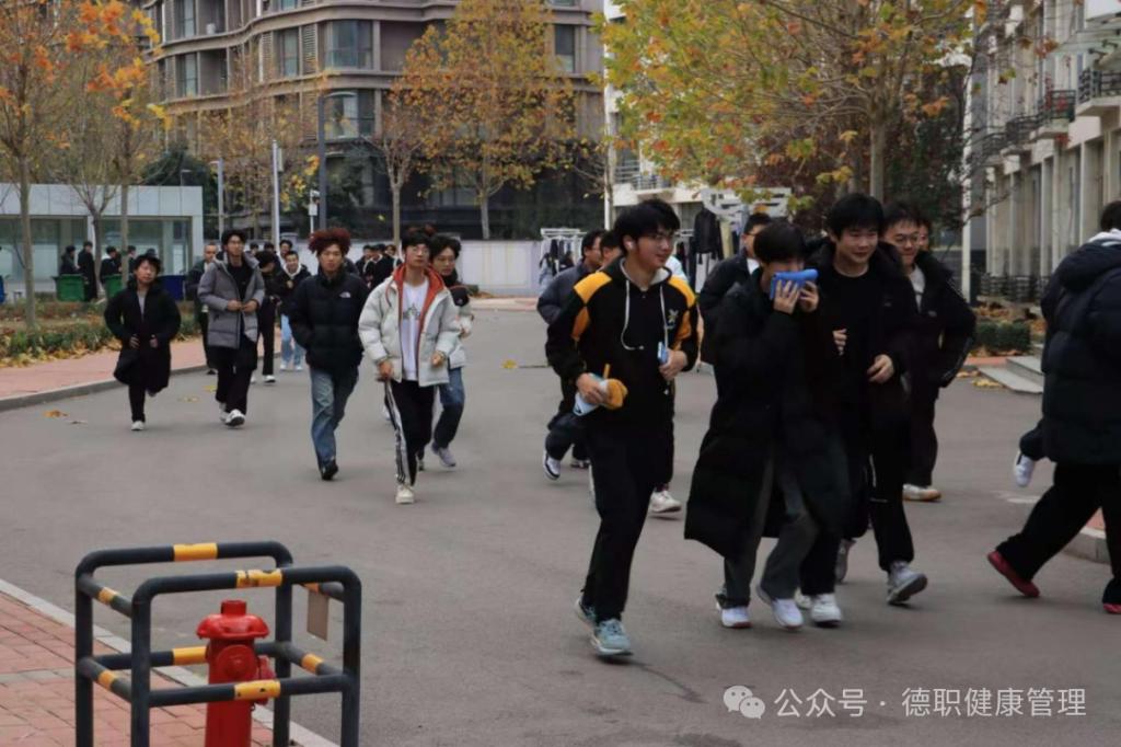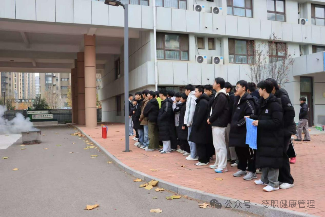 随着警报声响起,消防演练正式拉开帷幕,同学们反应迅速,严格遵循预定疏散路线,规范做好“湿毛巾掩口鼻、弯腰低姿行进”的防护动作,有序撤离至安全区域;随后现场工作人员详细讲解灭火器规范使用流程并组织实操演练,同学们熟练掌握核心操作要领与初起火灾扑灭技巧,消防安全应急处置能力得到有效提升。