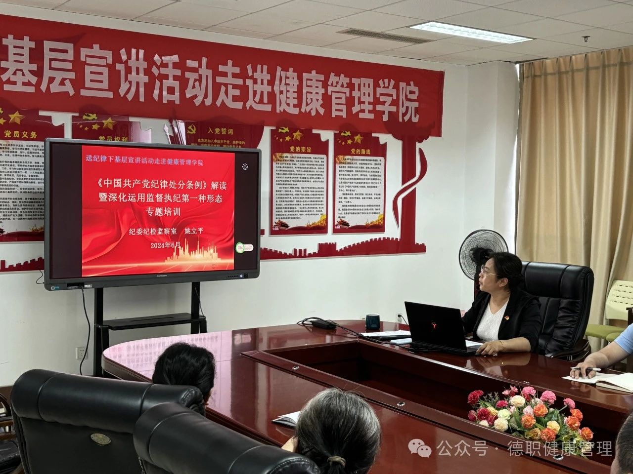 为深入贯彻落实习近平总书记关于党纪学习教育的重要指示精神,推进党纪学习教育走深走实,帮助全体党员深入理解《中国共产党纪律处分条例》的具体内容,6月14日beat365英国官网网站邀请学校纪委委员、纪检监察室主任姚立平开展专题讲座。院长王英博和全体教师党员、学生党员、群众代表参加了本次培训,党总支书记范轶主持。