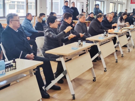 王建红老师现场展示精油调配,基础油橄榄油倒入量杯中10ml,其次是单方精油,薰衣草滴入2滴,具有醒脑、开窍,缓解肌肉酸痛功效,迷迭香3滴,甜茴香3滴,甜橙2滴,然后搅拌调匀,倒入空瓶中保存,保存时长达6个月,调配好的精油适用于颈部不适,可涂抹按摩,效果佳。校领导跟着王老师的节凑调配精油,把精油滴入准备好的量杯中,分别加入迷迭香精油、薰衣草精油等等,均匀搅拌后,现场分享,按摩,切身感受芳香精油的魅力。