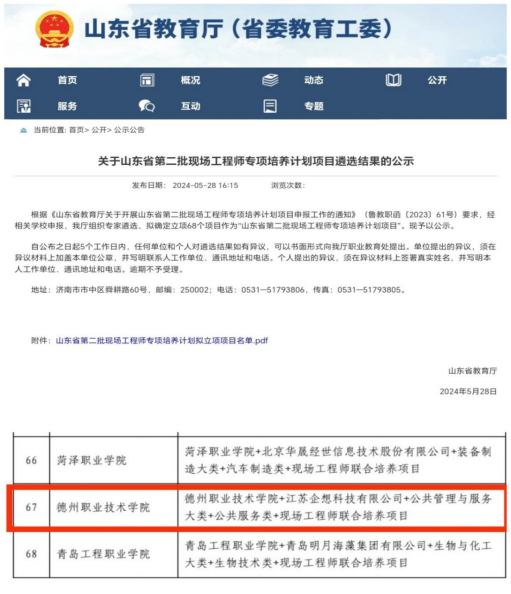 德州职院成功入选省第二批现场工程师专项培养计划拟立项项目