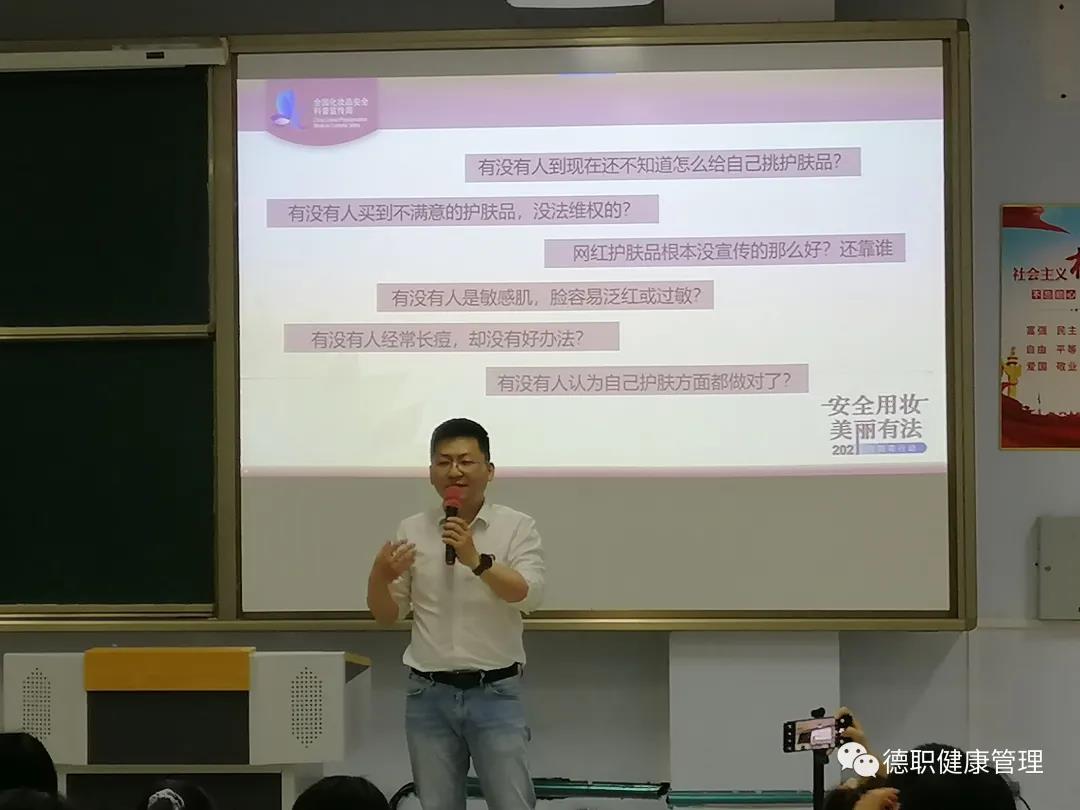 为进一步加强化妆品安全科普进高校,提高大学生消费者对化妆品安全使用的认知水平,引导大家科学合理地使用化妆品,扩大宣传活动影响范围,加大活动影响深度,beat365英国官网网站于5月26日在C座505举办了化妆品科普宣传讲座。此次讲座邀请了山东省化妆品行业协会美妆科普专业委员会主任委员张墨川先生来讲解化妆品的安全用法。